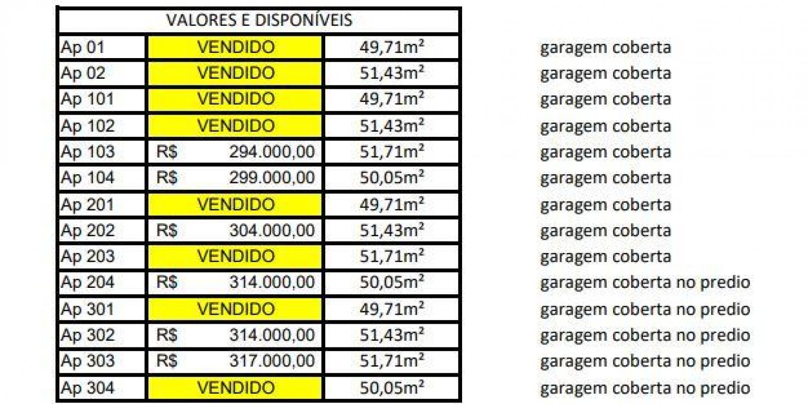 Tabela de preços anexada às fotos.